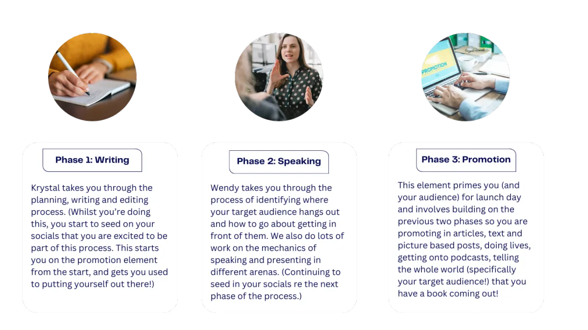 Krystal Hille (our brilliant publisher) guides you through the writing process, and believe me it will likely take longer than you anticipate!! She guides you through the whole process and we are both on hand to support you as it may throw up some emotional stuff you weren’t expecting. The writing is the first stage… and ONLY the first stage! As you’re doing this we encourage yout to share with your followers what you are doing. This keeps them engaged with you along the journey and plants the seeds for buying the book when it’s published. Share your thoughts on the writing process…